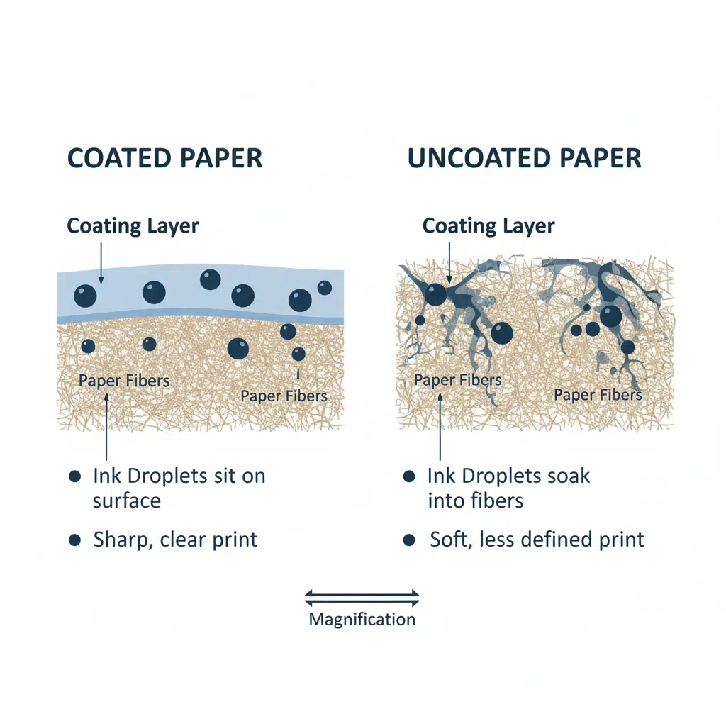 On uncoated stocks, the porous fibers act like a sponge. The ink is absorbed deep into the paper structure.