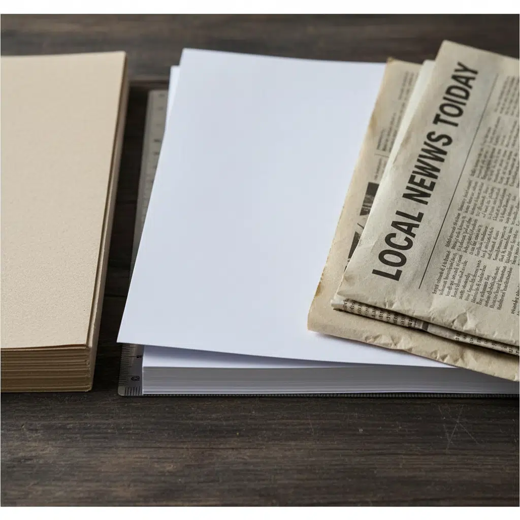 Newsprint is a cost-effective option made from mechanical pulp. It has a shorter lifespan and tends to yellow over time due to lignin content. While not suitable for durable textbooks, it is an excellent choice for disposable materials.