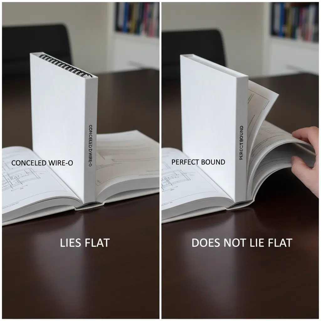 • Concealed Wire-O (Canadian Binding): The wire is hidden inside a hard or soft cover, providing a printable spine for bookshelves while retaining the lay-flat utility.