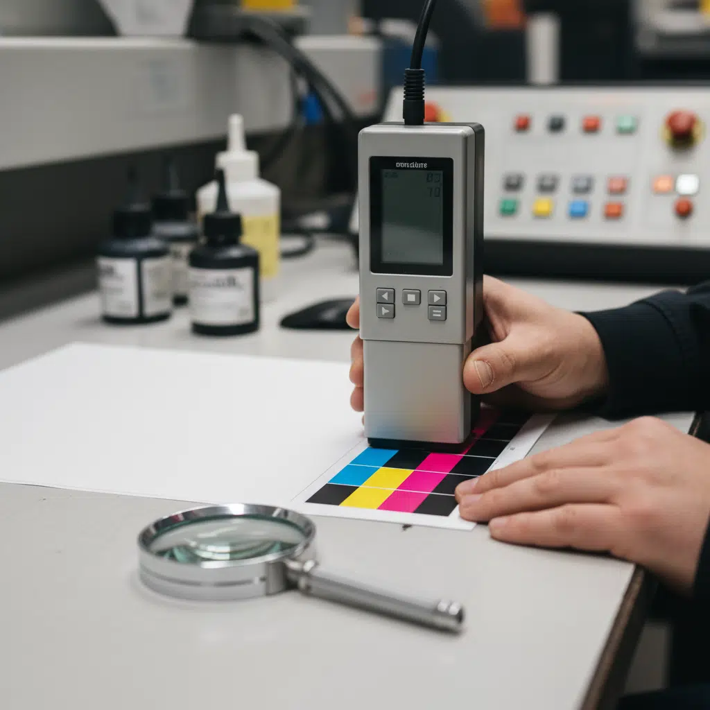 Professional printers rely on objective data, not just the human eye. Press operators use spectrophotometers y densitometers to measure color bars printed on the edge of the sheet. These tools analyze: