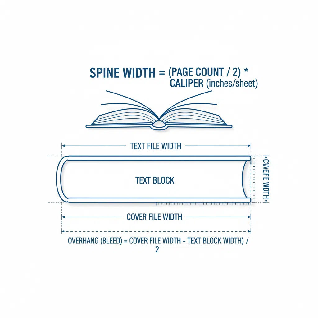 - Hardcover (Case Bound): This is more complex. The spine of the cover file must accommodate the text block plus the thickness of the greyboard cases and the hinge area. Typically, the spine board inside the cover is the width of the text block, but the printed cover file needs extra width (the “burn”) to wrap around the board. Always request a custom template from your printer for hardcovers.